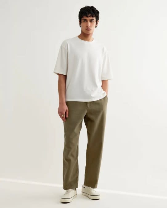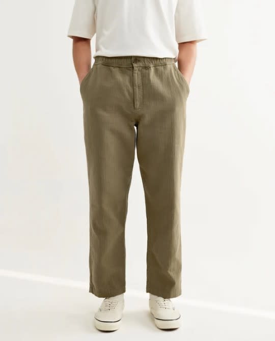 - Slightly cropped, tapered fit
